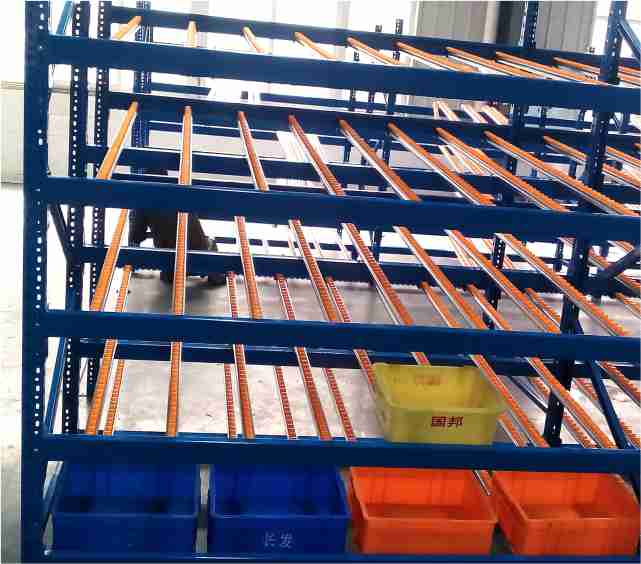 滾輪式料架簡(jiǎn)稱流利架,是將貨物置于滾輪上,利用一邊通道存貨,另一邊通道取貨。料架朝出貨方向向下傾斜,貨物在重力作用下向下滑動(dòng)。可實(shí)現(xiàn)先進(jìn)先出,并可實(shí)現(xiàn)一次補(bǔ)貨,多次揀貨。流利架存儲(chǔ)效率高,適合大量貨物的短期存放。